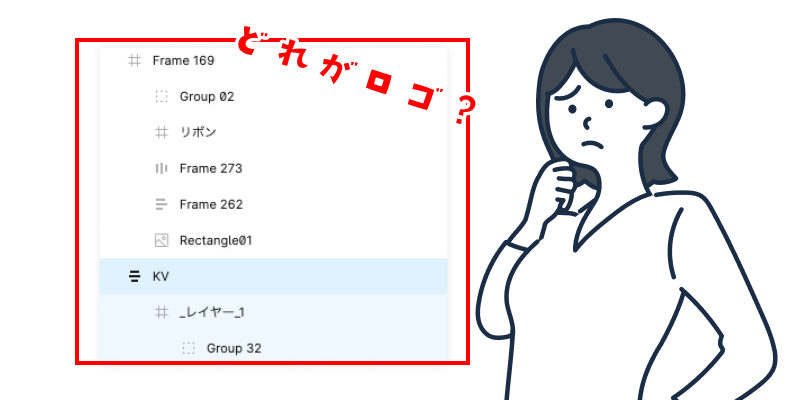 アートボード上のデザインは綺麗にし、レイヤー階層は汚いパターン。イラレに慣れてる方に多いイメージです。そもそもイラレはレイヤー概念が薄めなのであるあるですよね。ただこれWeb制作においてはNGです! figmaで作ろうがフォトショで作ろうがXDで作ろうがイラレで作ろうがレイヤー階層は綺麗(わかりやすく)にする!これ絶対。