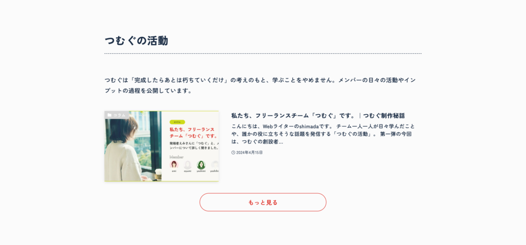 つむぐの活動履歴をブログでご紹介しています。このエリアは「投稿リスト」ブロックを使用。ブロックメニューで、表示する投稿数や表示順などお好みに合わせて細かく設定が可能です。