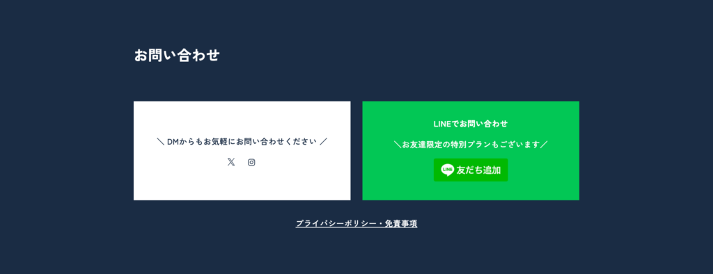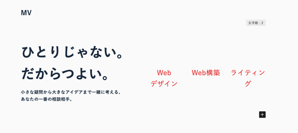 (左側の「ひとりじゃない。〜あなたの一番の相談相手。」、右側のサービス内容「Webデザイン、Web構築、ライティング」)