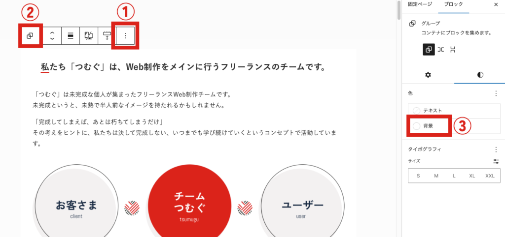 一番上のタイトル(私たち「つむぐ」は〜)から、一番下のボタン(つむぐの活動状況)までを選択し、①の縦3点ボタンをクリックし「グループ化」を選択します。するとエリア全体が1グループになります。(②のマークになっていればOK!)