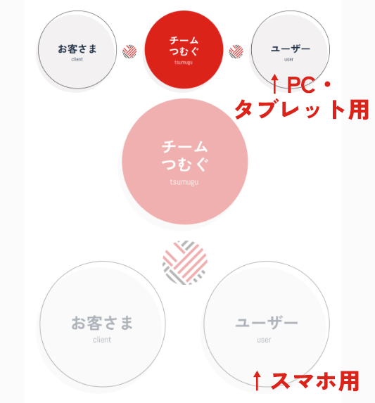 「つむぐ」とお客様/ユーザーを繋ぐイメージ図は、Figmaで制作したものを使用しています。PC /タブレット用とスマホ用とでそれぞれ見やすく表示できるよう、2パターンの画像を制作し、固定ページに入れ込んでいます。PC /タブレットサイズではスマホ用画像は非表示、スマホサイズではPC /タブレット用画像は非表示としています。