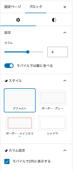 メンバー画像・名前・肩書きの部分は「カラムブロック」を使用。ブロックメニューでカラム数は4カラムに、カラム設定欄にて「モバイルで2列に表示する」にチェックを入れ、レスポンシブ問題を解消しています。