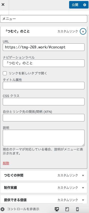メニュー項目とURLを入力します。ヘッダー・フッター・スマホ用ハンバーガーメニューなどそれぞれ異なるメニューが設定できるので、状況に合わせて細かく設定できるのがうれしいですね。