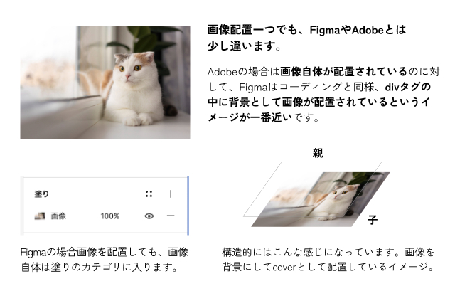 「Web制作のためのツール」ということがわかる一例として、他のデザインツールと画像の配置の違いや、Adobeソフトとの違いを解説。