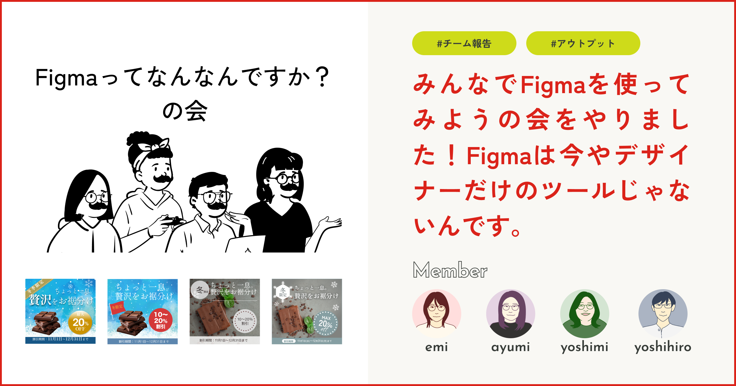 ということで、こばやすさんのバナー制作のお題をお借りし、みんなで30分間の時間制限を設けてバナー制作を行ってみました!