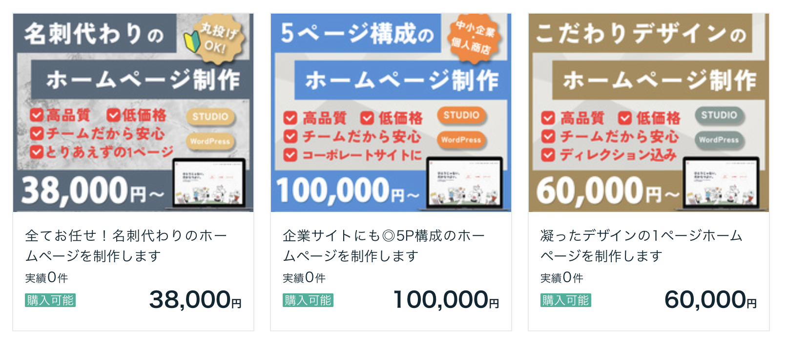 ココナラではつむぐは3つの価格帯でサービスを出品しています。駆け出しフリーランスやちょっとした個人ページを作りたい!という方から、中小企業のコーポレートページまでお客様に合わせたプランをご用意しているので、用途や予算に合わせて利用していただけるとうれしいです!