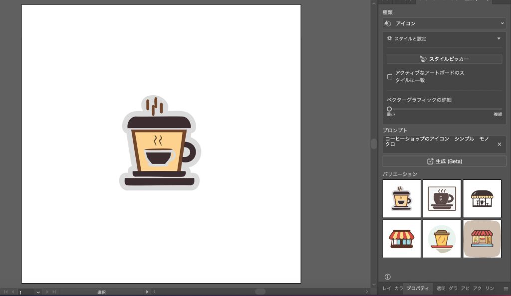 「プロンプト」部分に入力していきます。今回は「コーヒーショップのアイコン」「シンプル」「モノクロ」と入力しました。