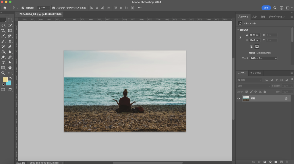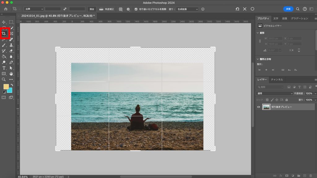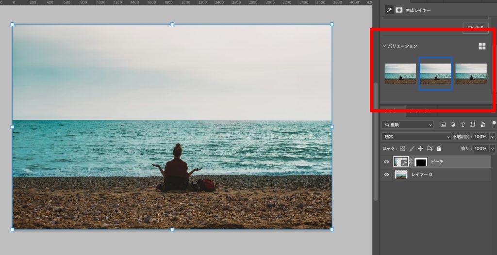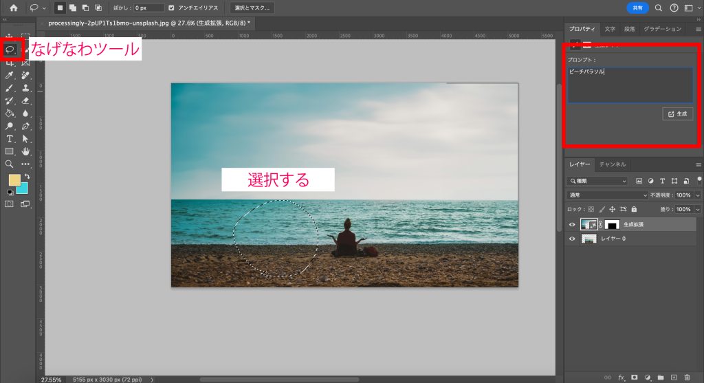 例えば上のビーチで女性が瞑想しているような画像を使いたいと思ったけど、上下や左右がもう少し大きかったら…なんて時。バナーやWebサイトを作る際に、微妙に幅が足りない場面に出くわすことがあると思います。そんな時に、Photoshopの「生成拡張」機能を使えば、背景を自然に延ばすことができますよ。