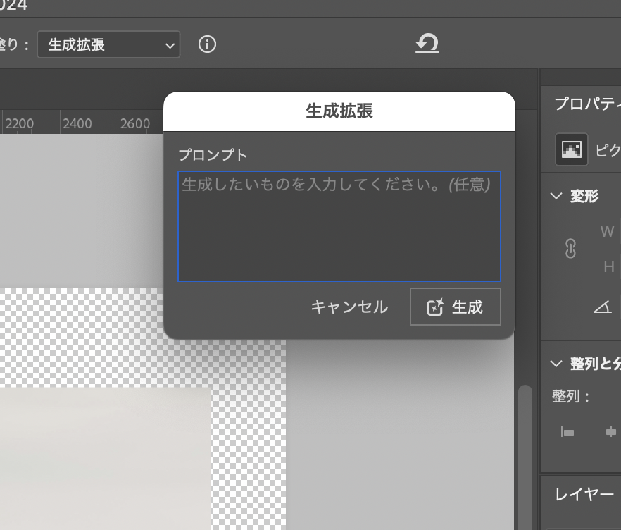 塗りを「透明(デフォルト)」「生成拡張」「コンテンツに応じた塗りつぶし」の3種類から選べます。「コンテンツに応じた塗りつぶし」にした場合どうなるか?次の項目に書いてます!