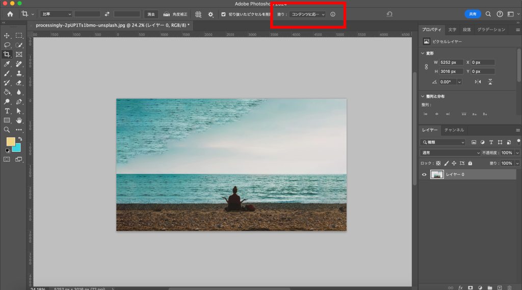 生成拡張ツールが搭載される前にも、「コンテンツに応じて塗りつぶし」機能はあり、場合によっては使用していました。真っ白な背景など単調なものであれば自然に背景を足してくれるのですが、今回の画像のように「空・海・砂浜」と少し複雑なものだと、広範囲に背景を延ばすのは難しいですね。