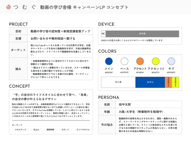ペルソナを軸に、「ネットリテラシーが高く、情報に敏感、フットワーク軽め(すぐに行動に移せるという意味で)」であることを想定しました。競合他社であるオンラインの動画/プログラミング/Webデザインスクールを参考デザインにし、その中でも「ブルー基調・キレイめ・情報が整理されている」ものに絞りました。
